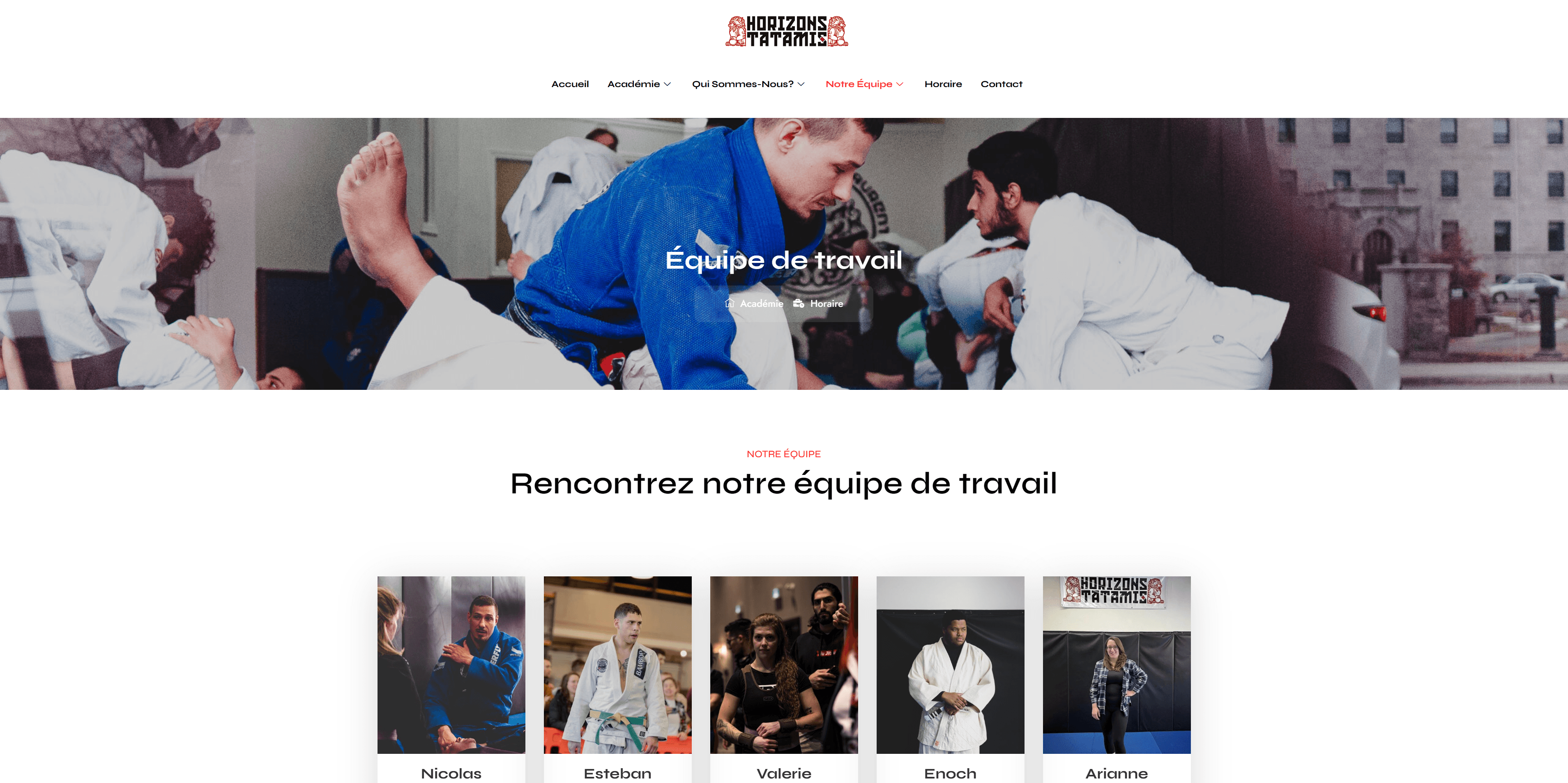 Develop a professional, bilingual website for Horizons Tatamis, a non-profit martial arts organization in Montréal, to highlight their community initiatives and promote their Jiu-Jitsu and Muay Thai programs. The goal was to provide an online space that reflects their values of inclusion, discipline, and empowerment while simplifying access to class information, registration, and donations.