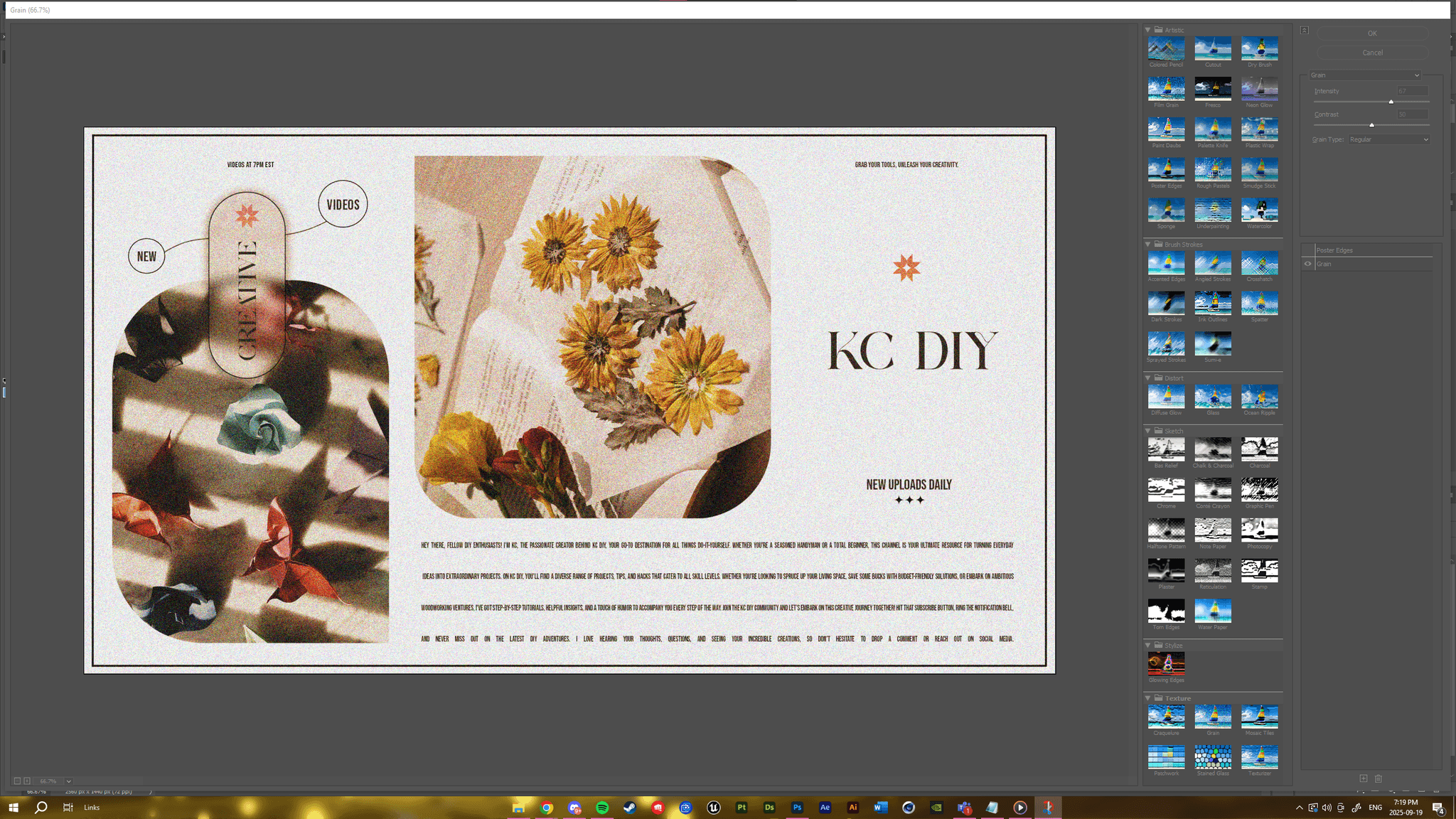 The main challenge was to create a visually cohesive intro and banner that matched the randomly assigned theme while staying original and technically precise. The animation needed to be exactly fifteen seconds long, in HD, and include specific techniques such as rotoscoping and trajectory animation, all without relying on copyrighted or AI-generated content. Another difficulty was ensuring that the animation and banner worked together as a unified visual identity for the channel, with a professional look that avoided pixelation or poor-quality assets.