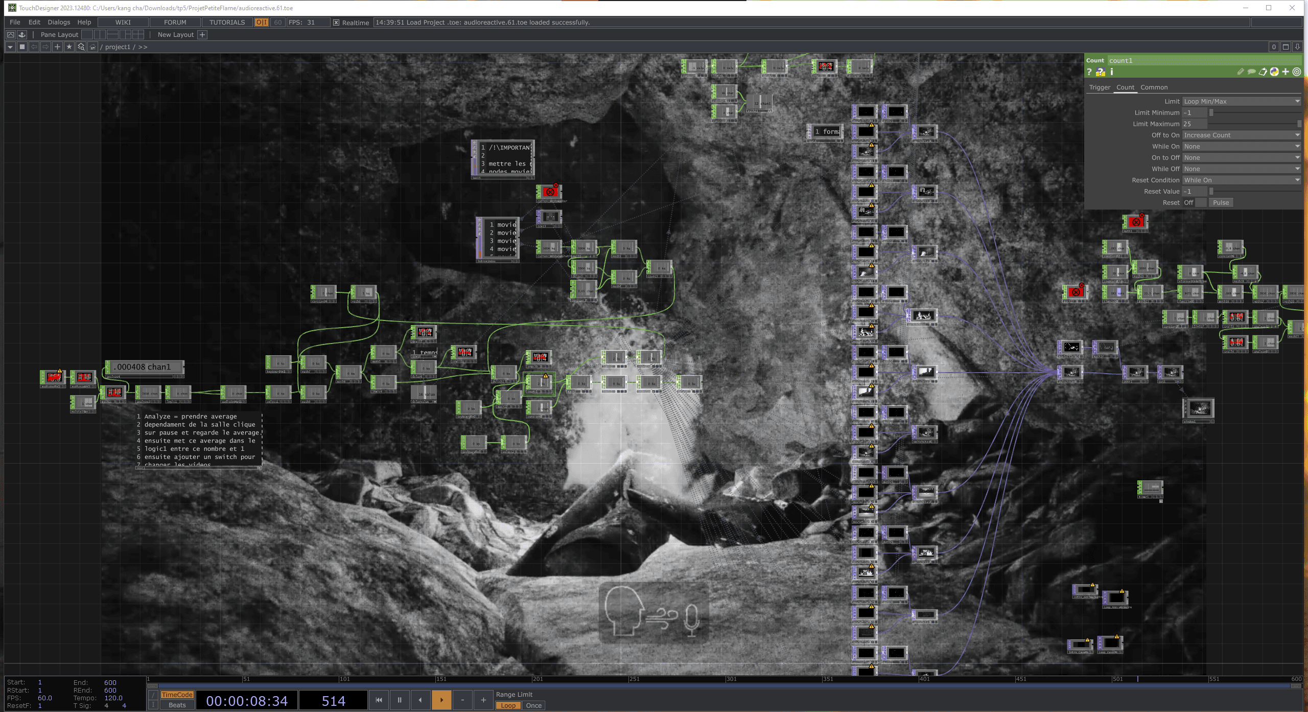 Finally, I reviewed my TouchDesigner skills in the context of interactive installations. I also developed my ability to create immersive scenes with a strong atmosphere, considering aesthetics, sound, and the overall experience. Interacting with the audience was also a new aspect for me.