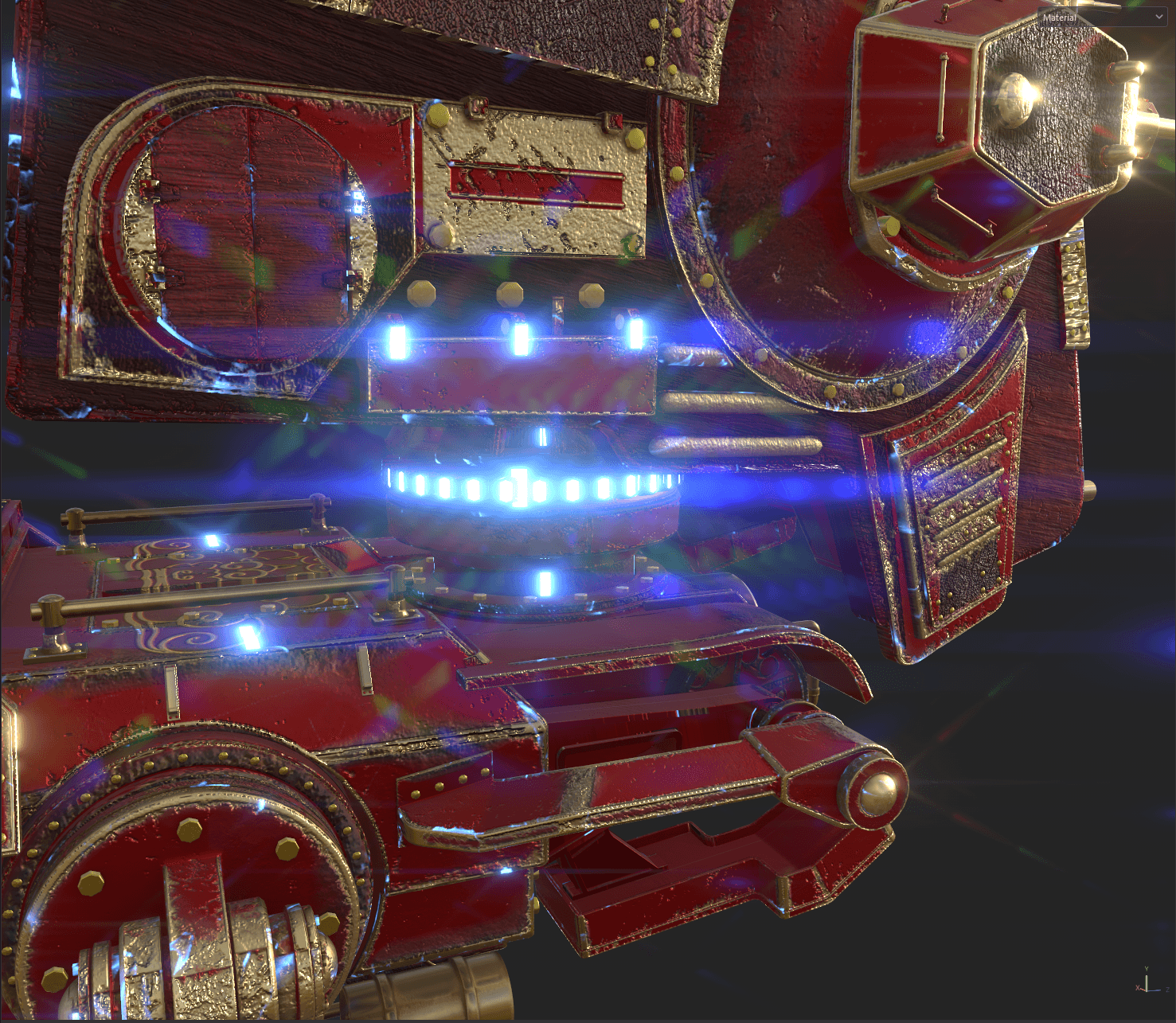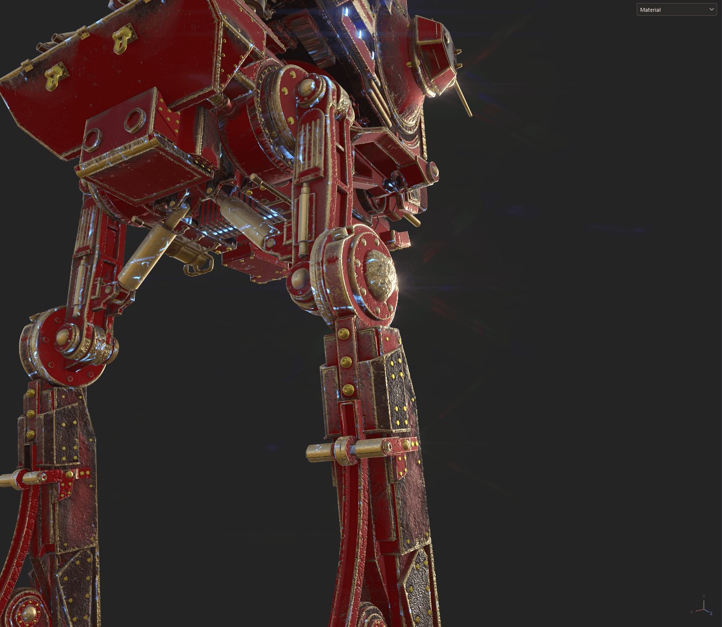 In the end, careful layering, anchor points and color control helped create harmony between the worn red lacquer, golden trims, and subtle light sources. The final look feels both ancient and alive, like a mechanical warrior powered by forgotten magic.