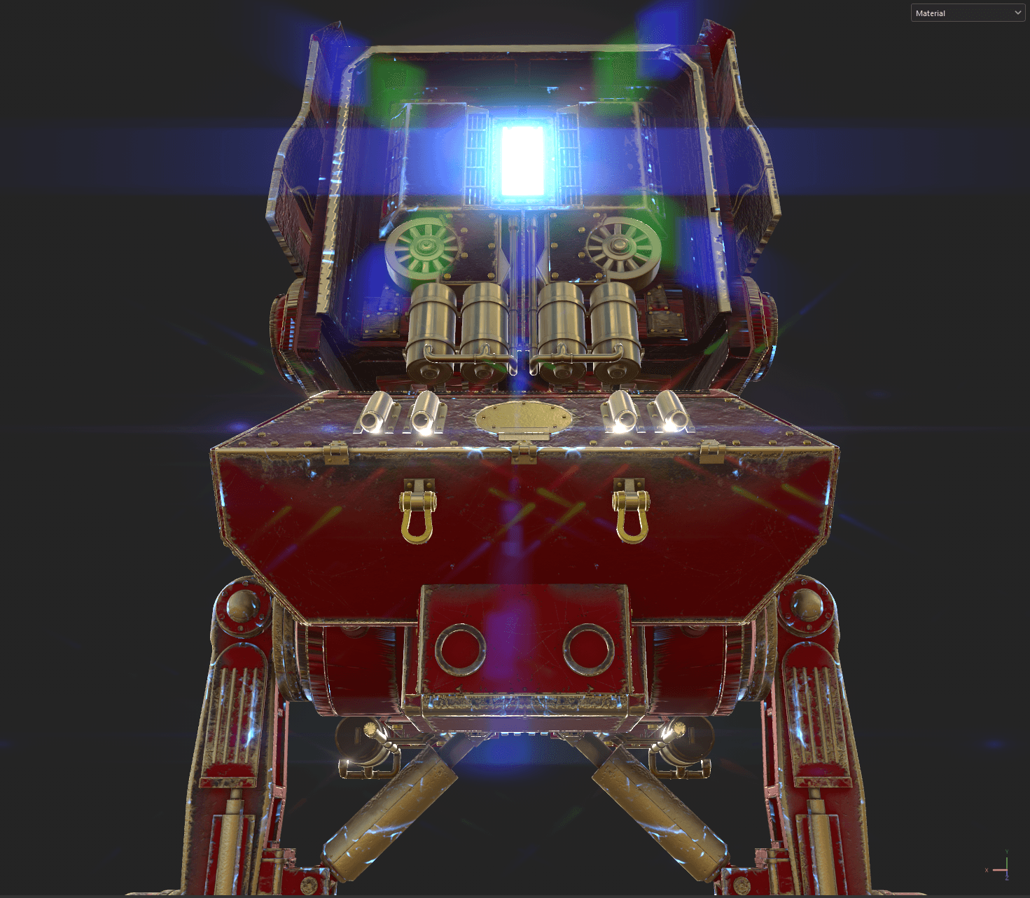 I added a glowing crystal material under the armor to suggest an inner life force, giving the impression that the robot’s core energy comes from something mystical rather than mechanical. The small glowing dots beneath the broken plates were meant to look like an aura leaking through cracks, symbolizing power and ancient energy at the same time.